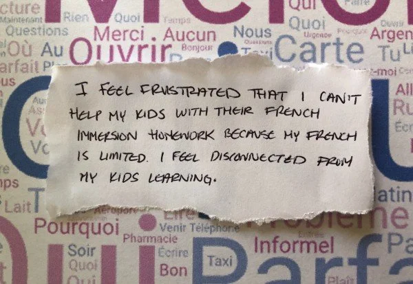 Postcard reads: I feel frustrated that I can’t help my kids with their French immersion homework because my French is limited. I feel disconnected from kids learning.