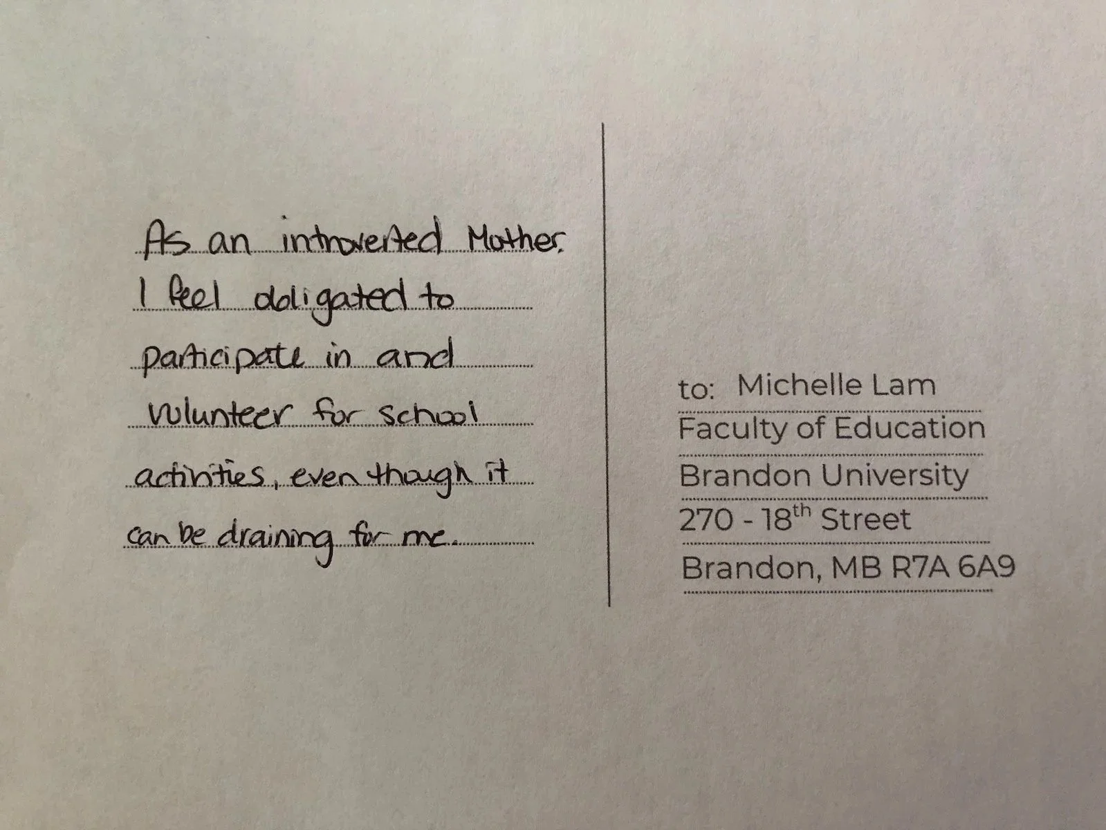 Postcard reads: As an introverted mother, I feel obligated to participate in and volunteer for school activities, even though it can be draining for me.