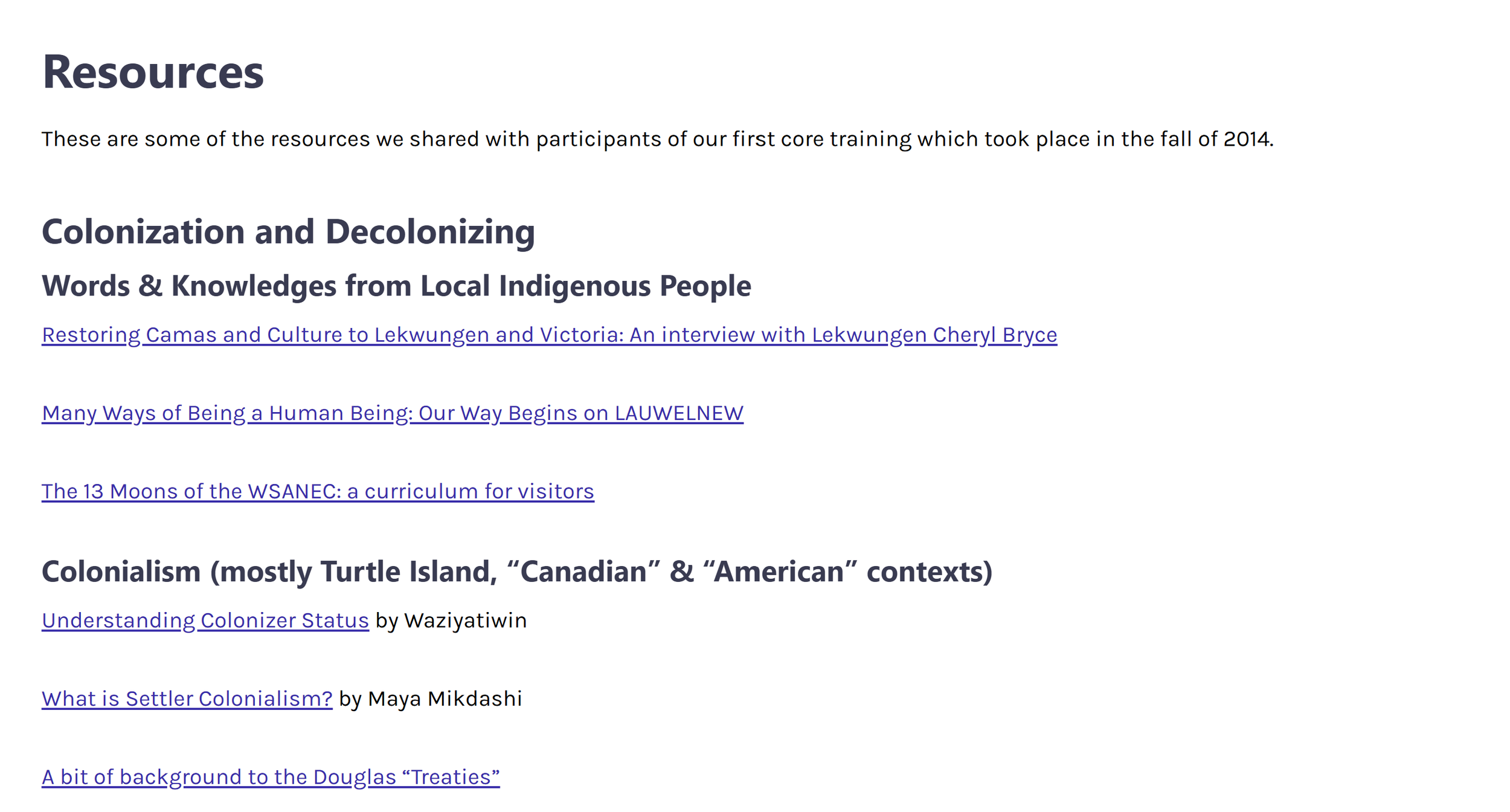 A resource list compiled by Victoria Sexual Assault Resource Centre that includes information on colonization and decolonizing, whiteness, racism, trans lives, ableism, masculinity, and allyship.