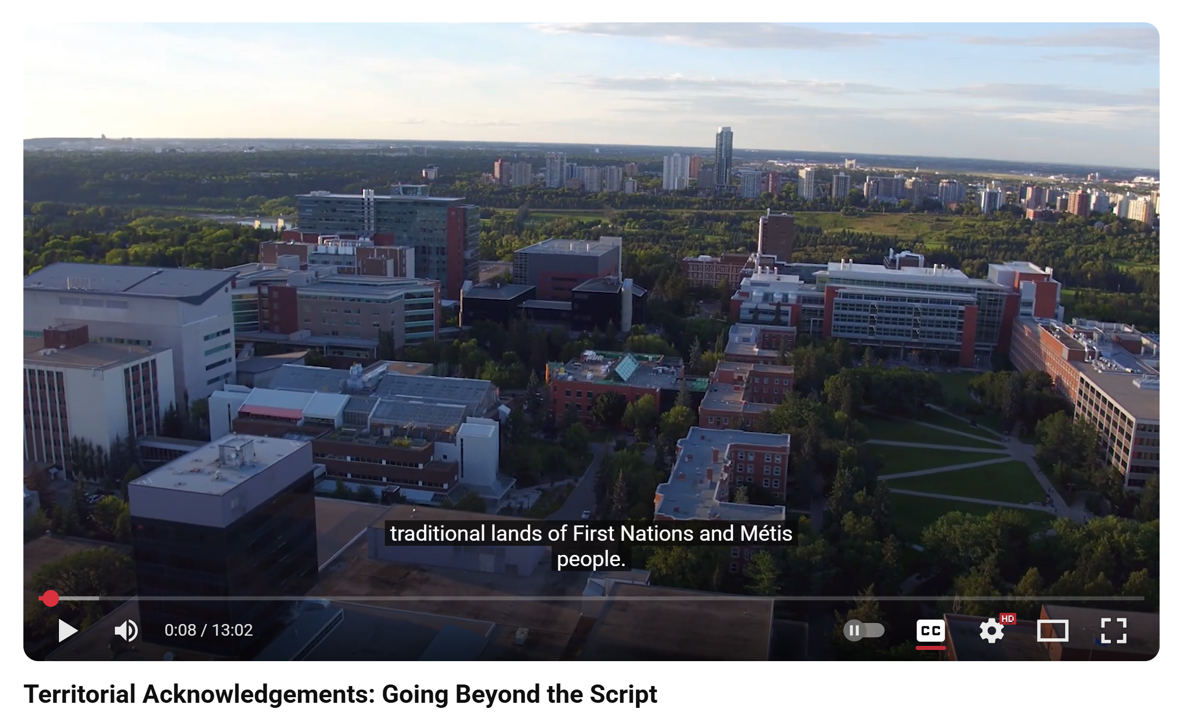 For teachers/facilitators giving a land acknowledgement, this territorial land acknowledgement video from the U of A Centre for Teaching and Learning offers seven tips for creating your own acknowledgement.