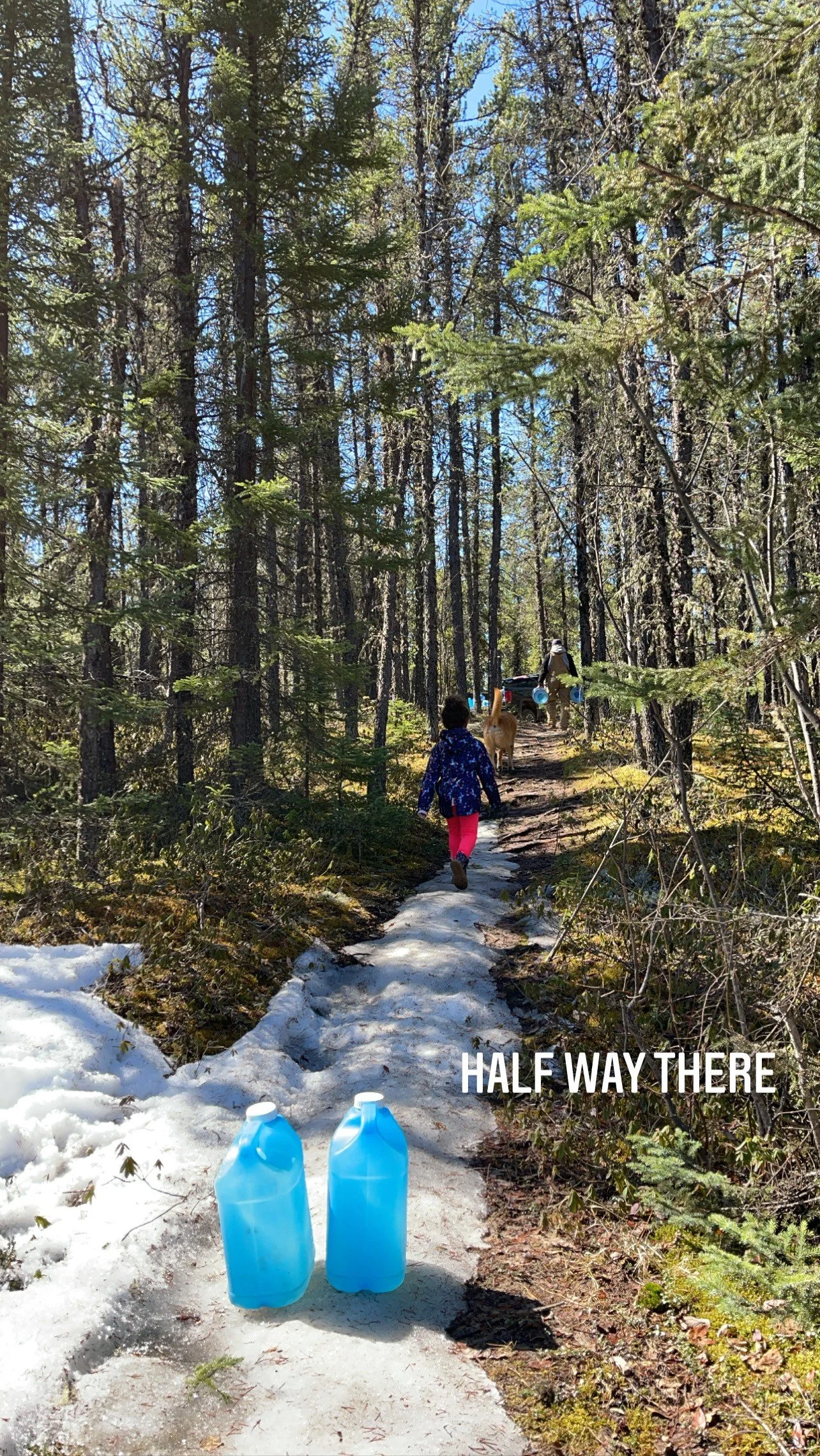ᓰᐲᓯᓵᐳᕀ sîpîsisâpoy Creek By Julia Stoneman Sinclair Growing up, I was taught that women carry the responsibility of being water carriers/protectors. I had an inherent connection with water before I knew I held this responsibility as a woman and mother. Growing up in the North, I was surrounded by water my entire life. I walked out of my house and was welcomed to the sights, smells, and sounds of the lake close to us. The loons were always singing, moose would roam on the shore, and food was abundant in the gift of fish that the lake gave us. I have sat beside the water in times of great sorrow and grieving and at times of celebration and happiness. It has always been there to care for its people. This picture shows that, unfortunately, Mother Earth is affected by human activity across Turtle Island and the world. Lynn Lake was a mining town, and we have been under a boil water advisory for the majority of my life. The water isn’t clean to drink or sometimes even bathe in. The day we took this picture, we went to a creek out of Lynn Lake and filled water jugs for four households as the only clean water filter at the Northern had been broken for a few days. This was the only way to have clean water. Humans have damaged this land, but it still provides ways to care for us, like this spring of free, clean water for the community to drink. It's only making sure you have the means to get there and haul the water.