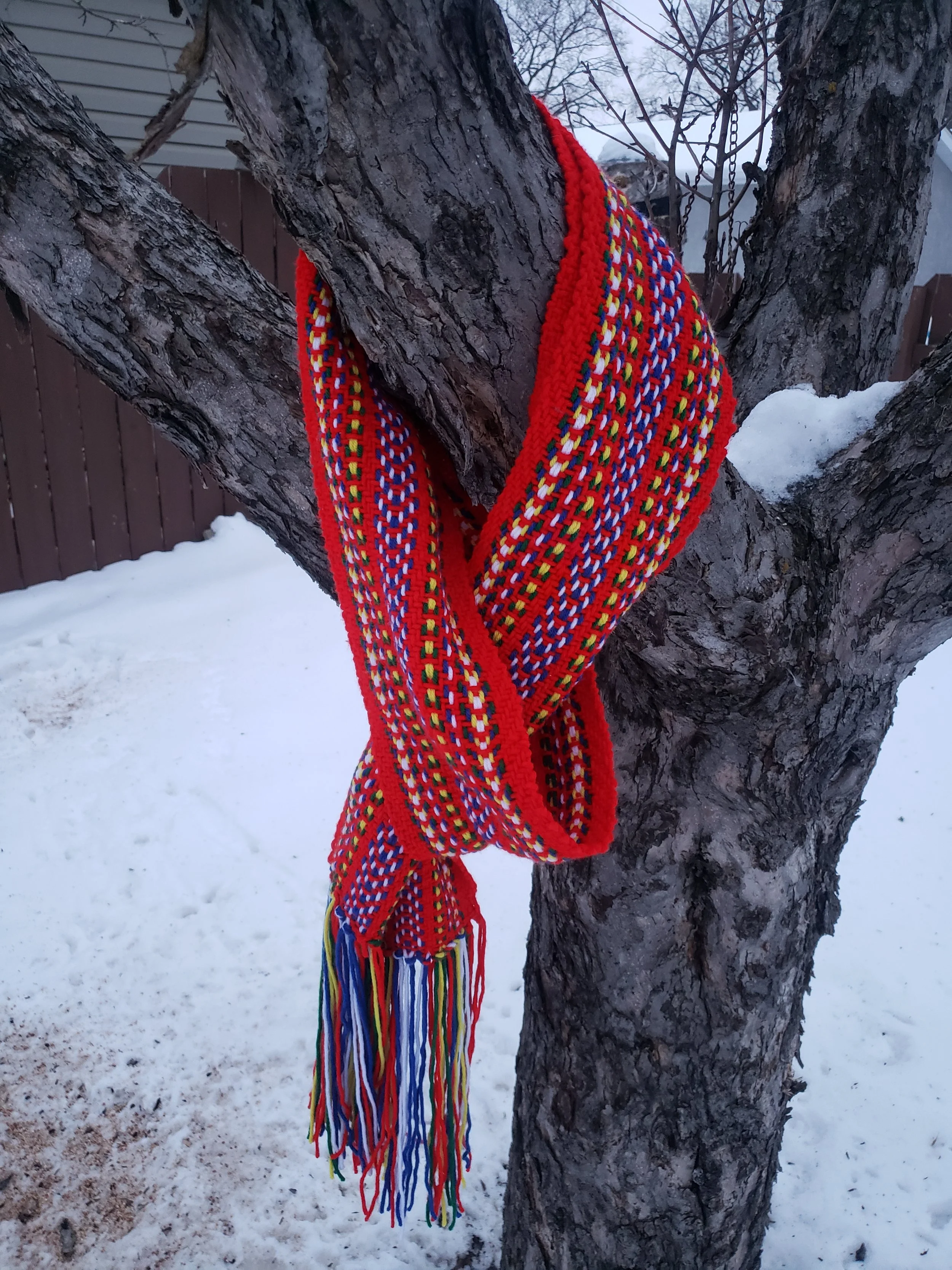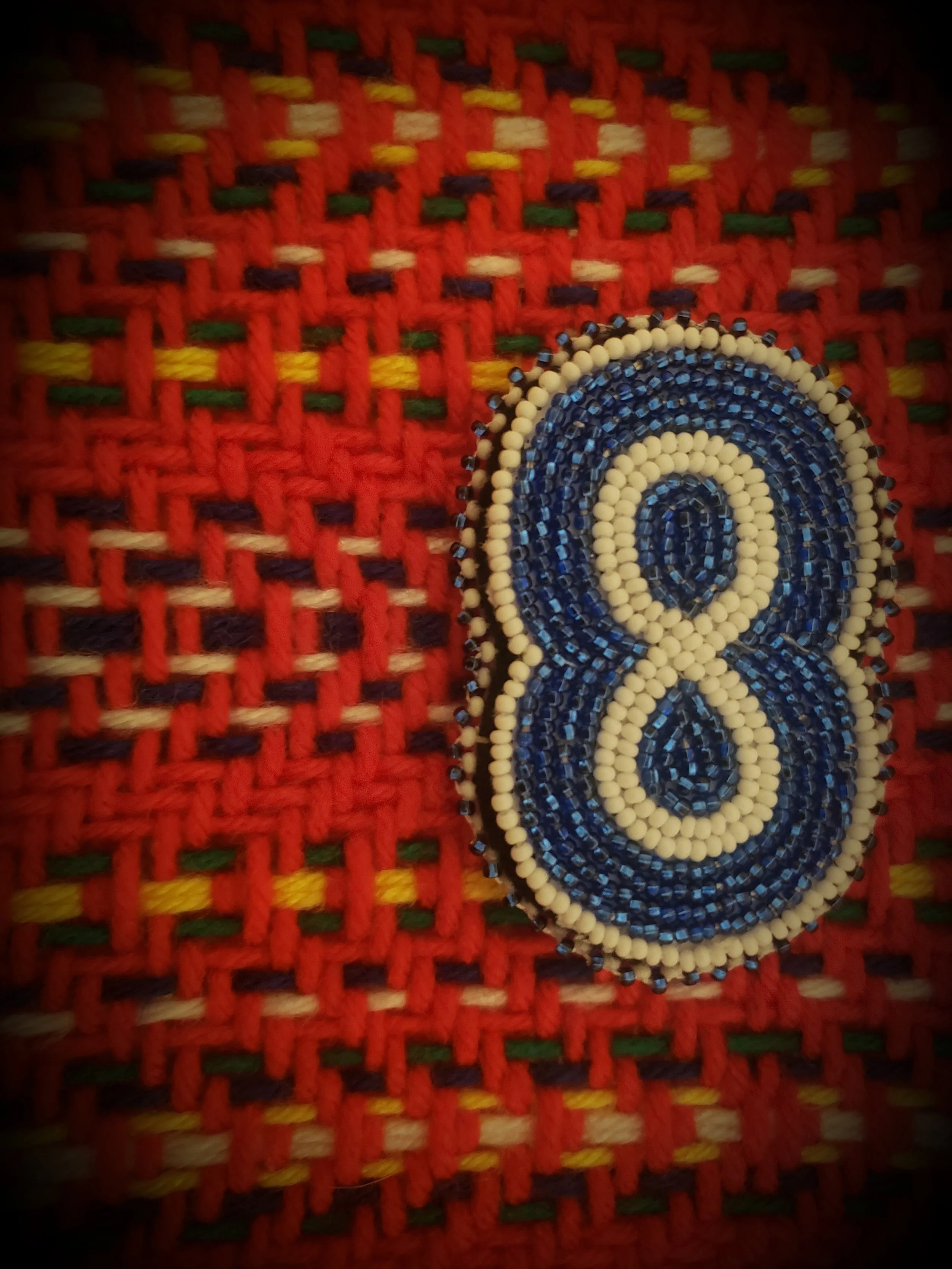 Infinity Pin / Sash by Alison Downing. The arrowhead sash and blue infinity flag are the most commonly recognized symbols of the Red River Métis People. These symbols represent the distinct culture, history, language, and traditions of the Red River Métis People. The sash and pin were crafted by Alison Downing.