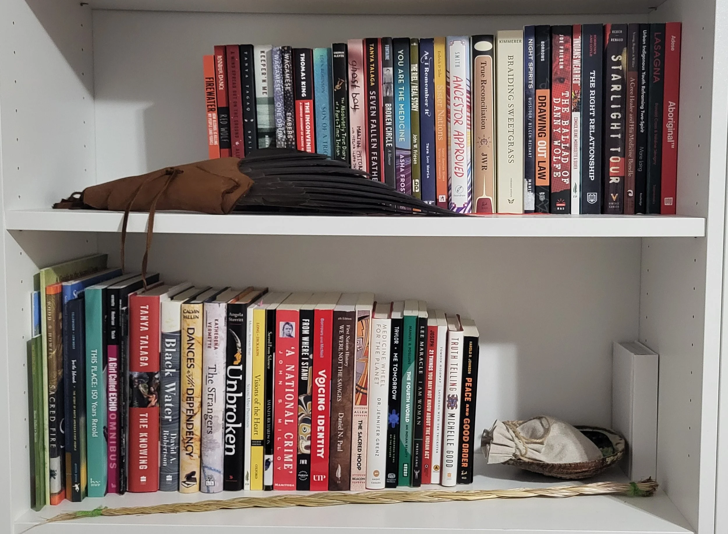 Reconnection by Brittany Knight. I took a photo of my book shelf, where I have books on different Indigenous subjects/perspectives. On my shelf, I also have some traditional medicine, along with a goose wing I received from an elder to help smudge. If you do not live in your community, you may not have access to knowledge that elders may possess. As I do not have access to my elders, due to distance between us or them passing on, I collect as many books as I can to help widen my knowledge.
