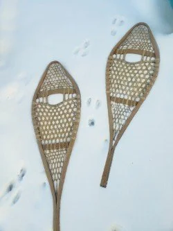 Snowshoes by Alison Downing. These traditional snowshoes (wood and rawhide) given to my husband by his dad, represent the journeys that many Indigenous People have taken away from their home communities, families, and traditional lands. This picture is dedicated to my father-in-law who passed away in 2024.