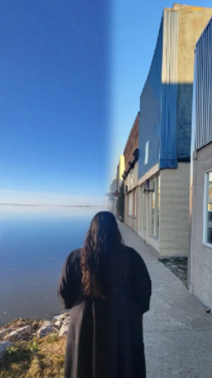 Two Worlds by Brittany Knight. This photo was taken in two locations, each representing a different part of where I have lived. On the left side, it showcases a lake to represent my life in Northern Manitoba. The right side depicts a street to highlight my life in the city. In the centre, I am standing in the middle of both locations. This is to highlight that no matter where I am, I am still me despite my location.