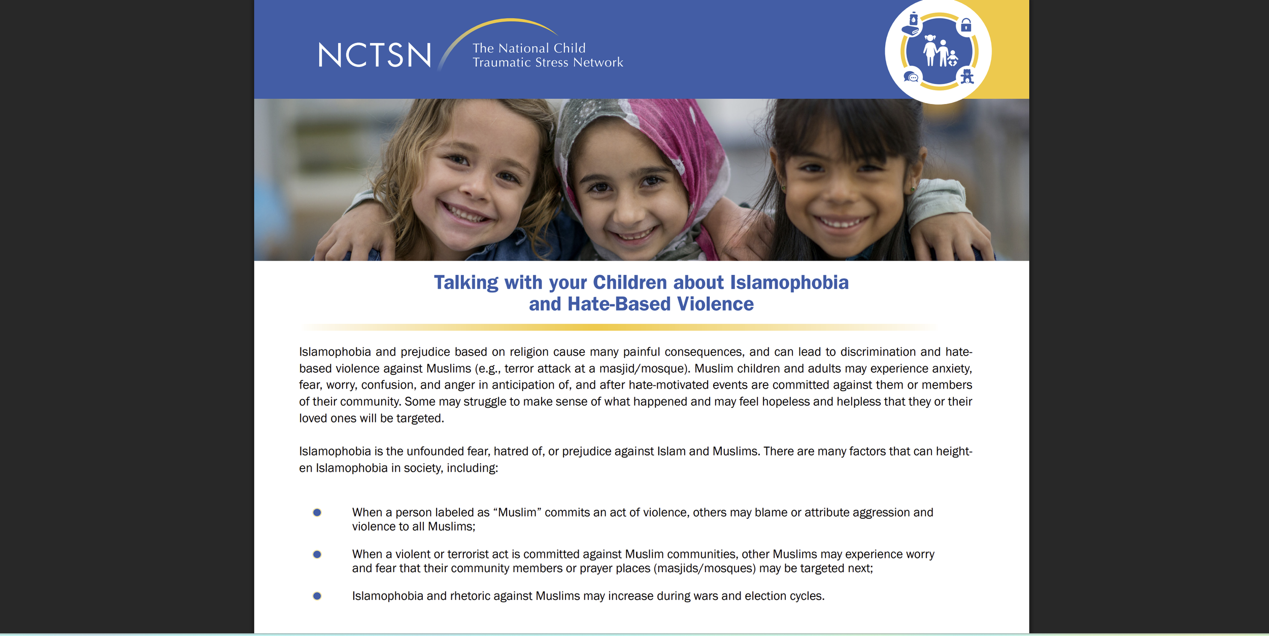 This Factsheet from the National Child Traumatic Stress Network contains age-specific guidelines for talking with children about Islamophobia and hate-based violence, and helpful tips for parents and caregivers.